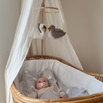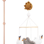 Blød strikket svane med rolig musik. Bamsen er en kær og uimodståelig krammeven, og med sine dinglende lange øre, arme og ben samt søde smil, bliver den hurtigt en af barnets yndlings bamser. Træk i træringen og uroen vil spille den fineste, klare og rolige vuggevise "Sleep baby sleep", som kan få enhver baby til at slappe af.