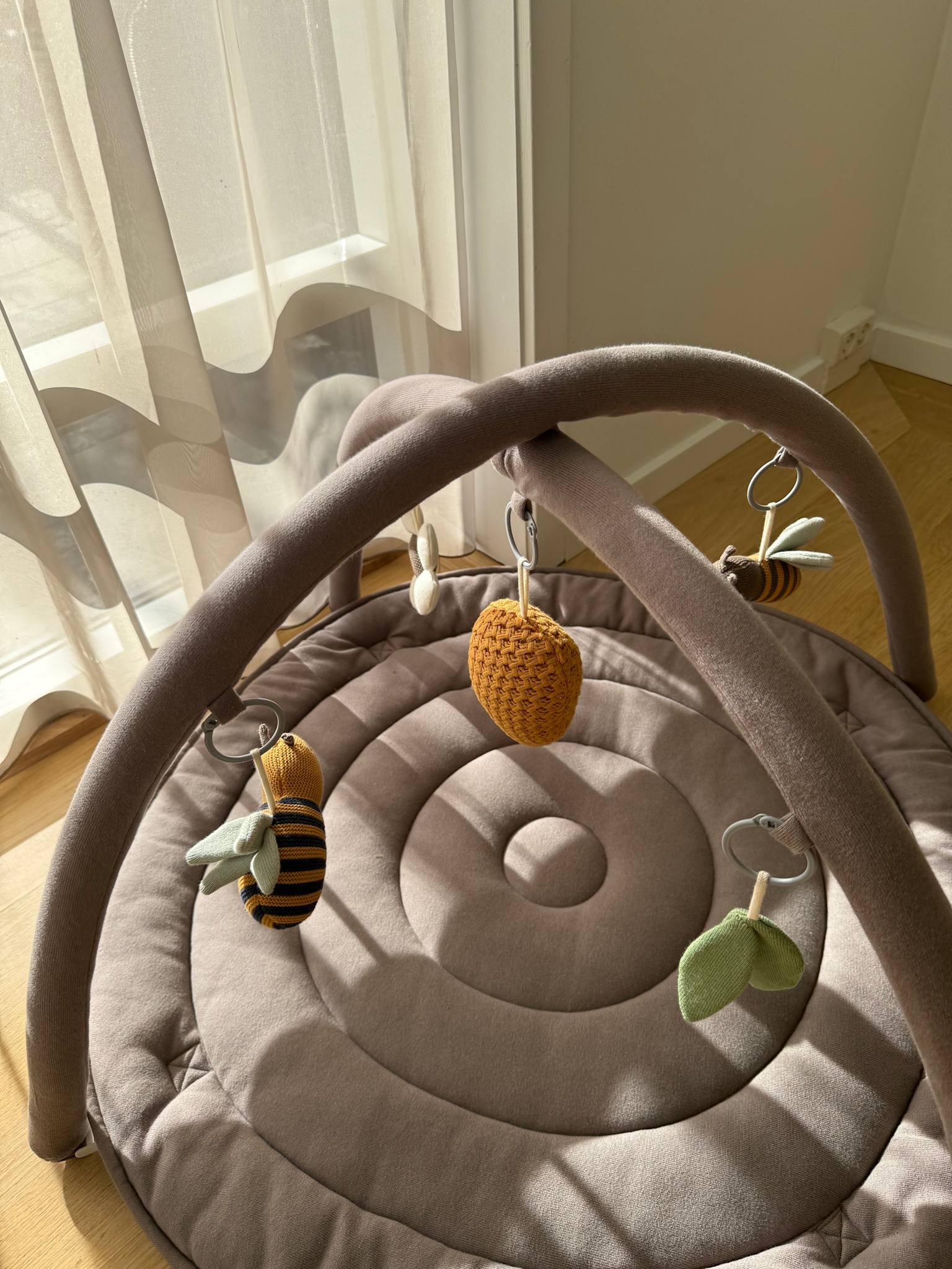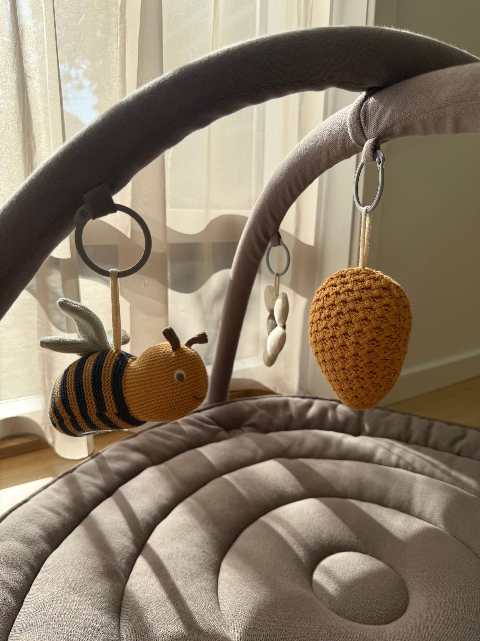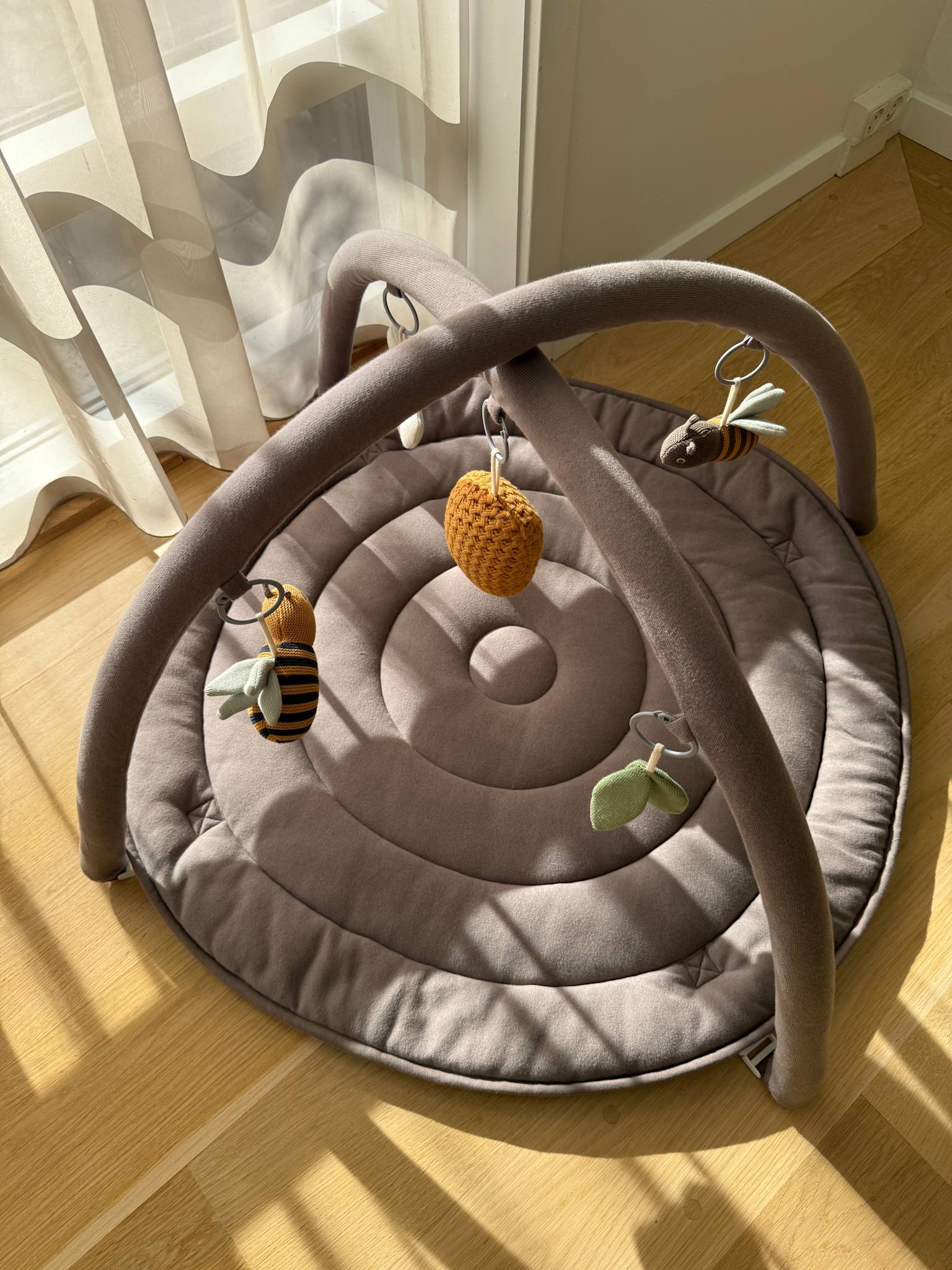 Aktivitetstæppet er udstyret med blødt legetøj i forskellige højder, der opfordrer dit barn til at udforske og gribe fat i legetøjet. Dette hjælper med at udvikle deres motoriske færdigheder og hånd-øje-koordination på en sjov og interaktiv måde.
